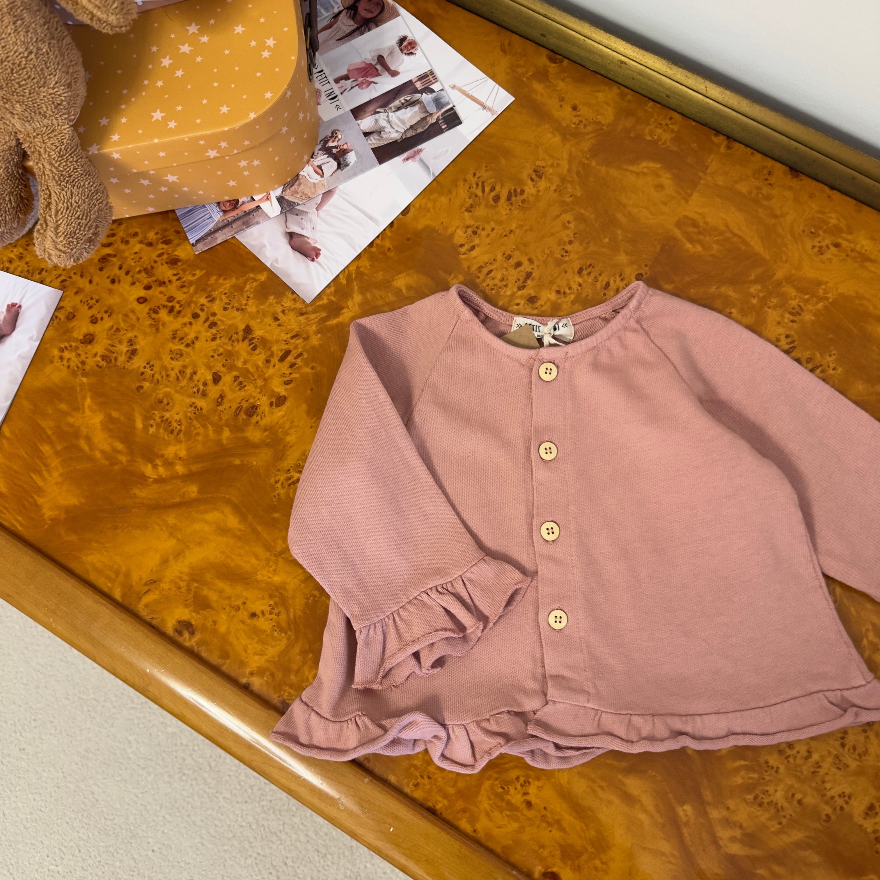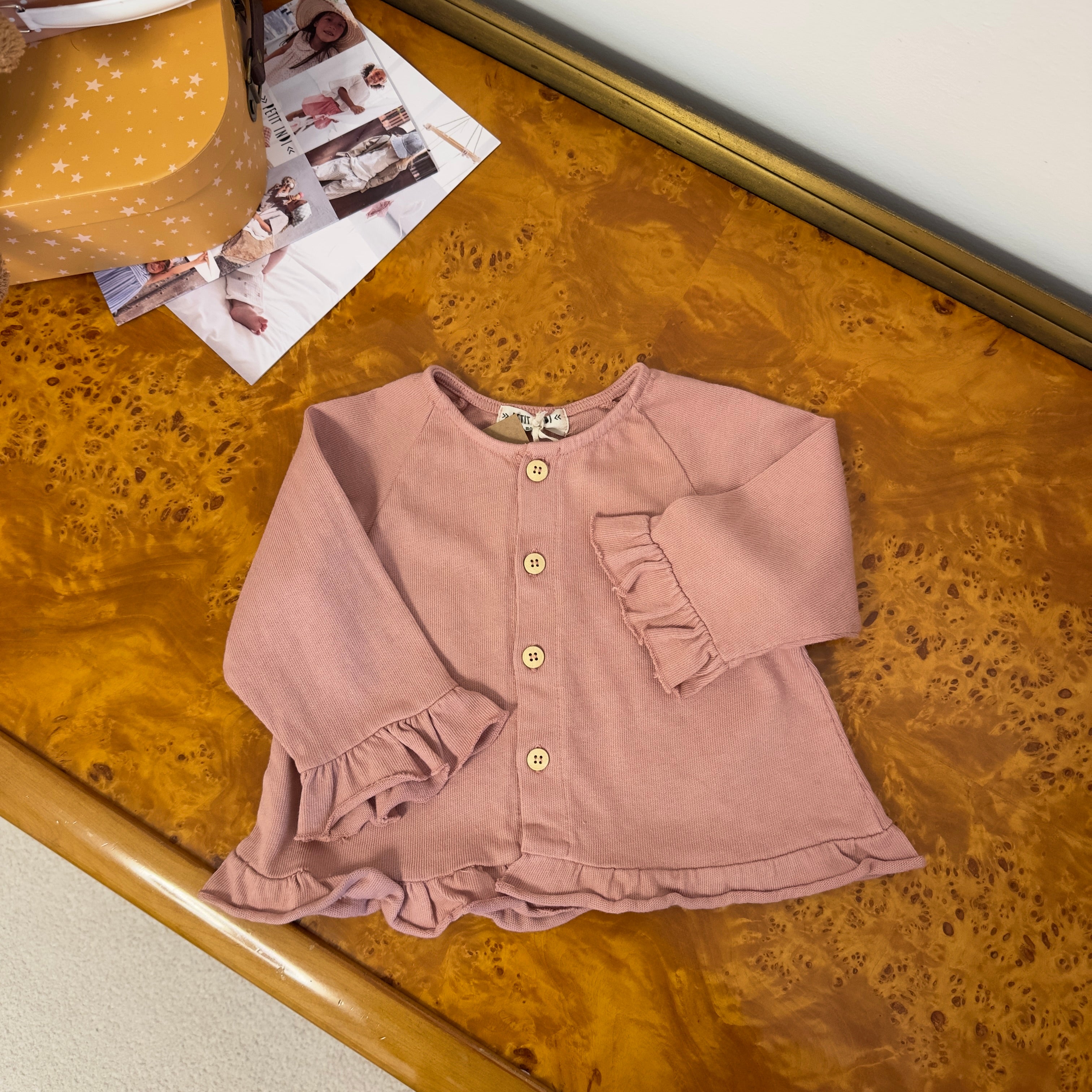 Cardigan rosa antico con ruches su maniche e fondo e bottoncini in legno
