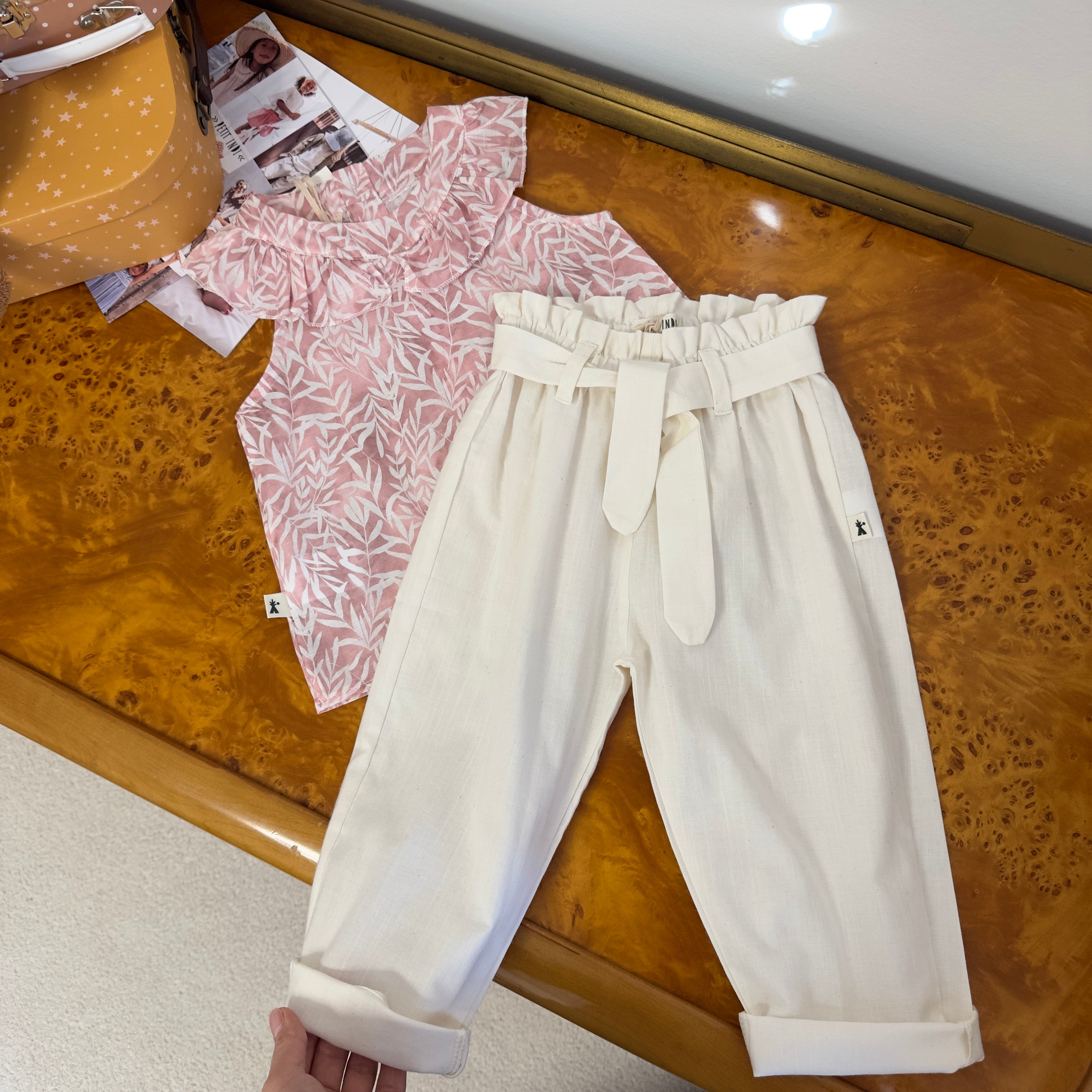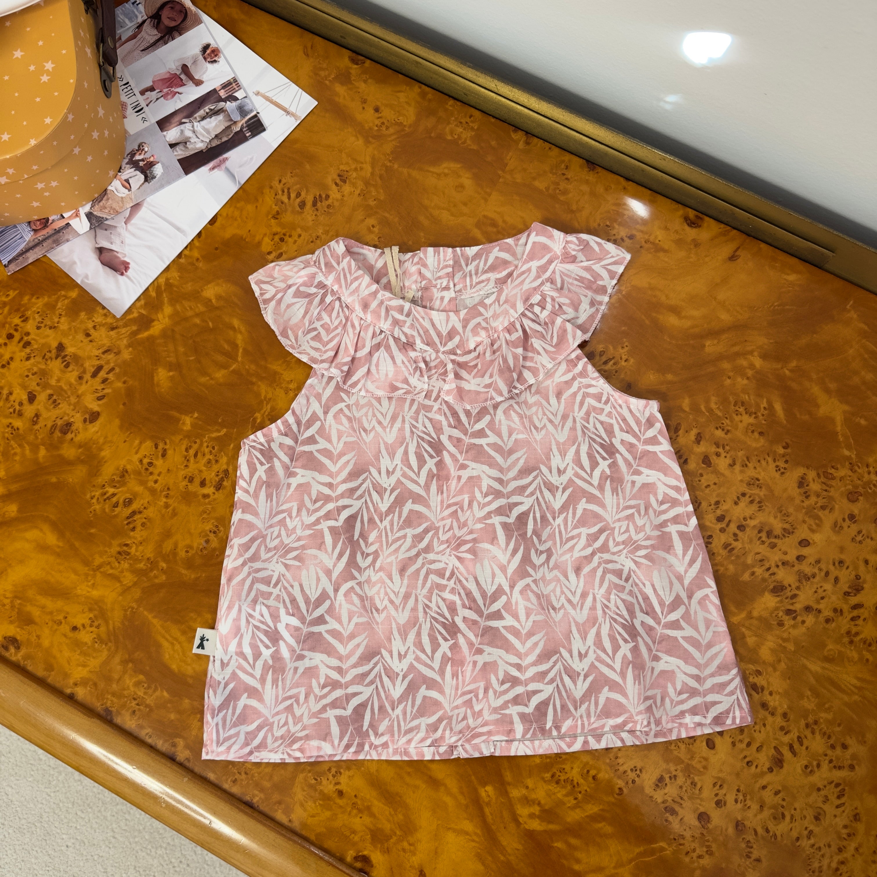Blusa rosa antico con fantasia a foglie e colletto particolare – versatile e facile da abbinare