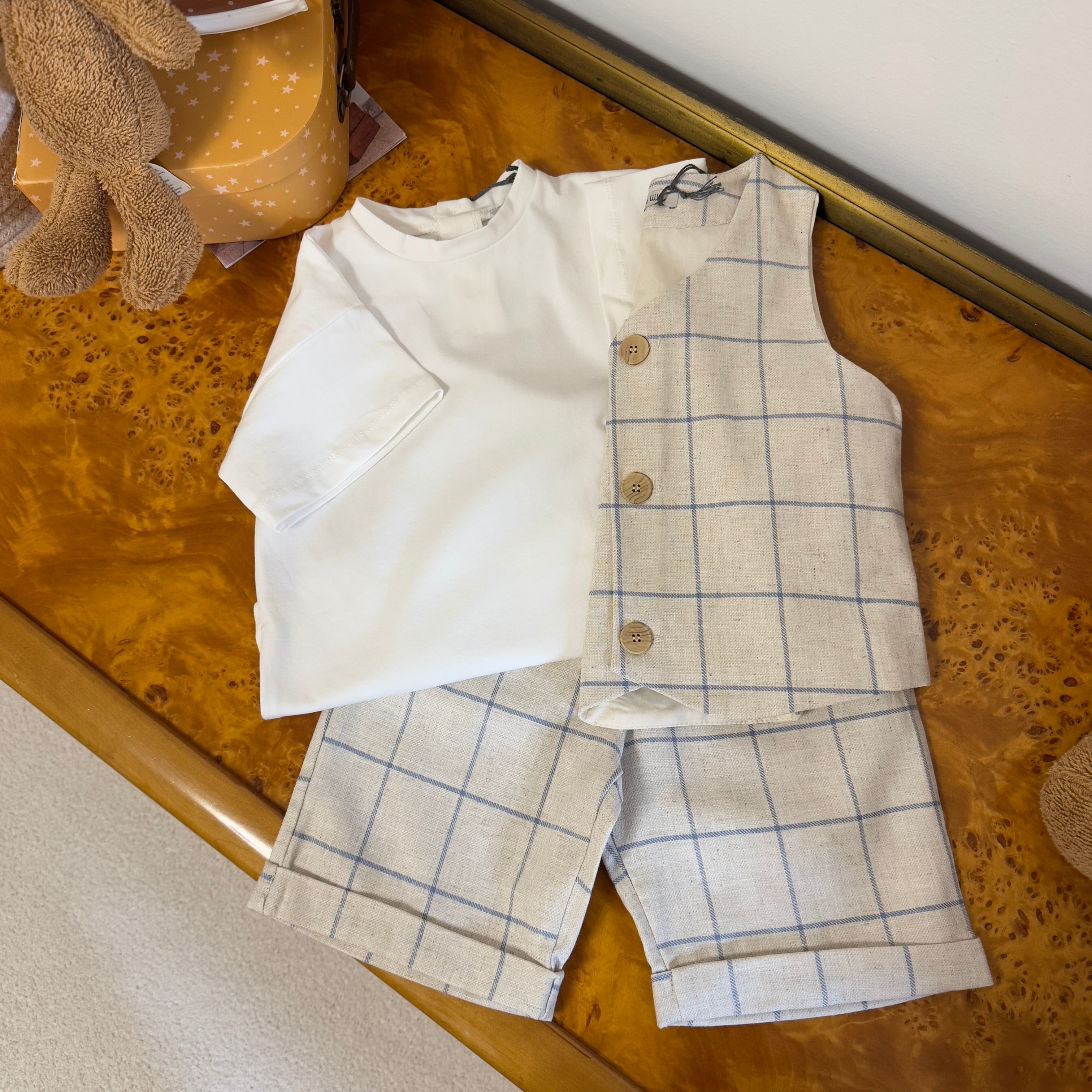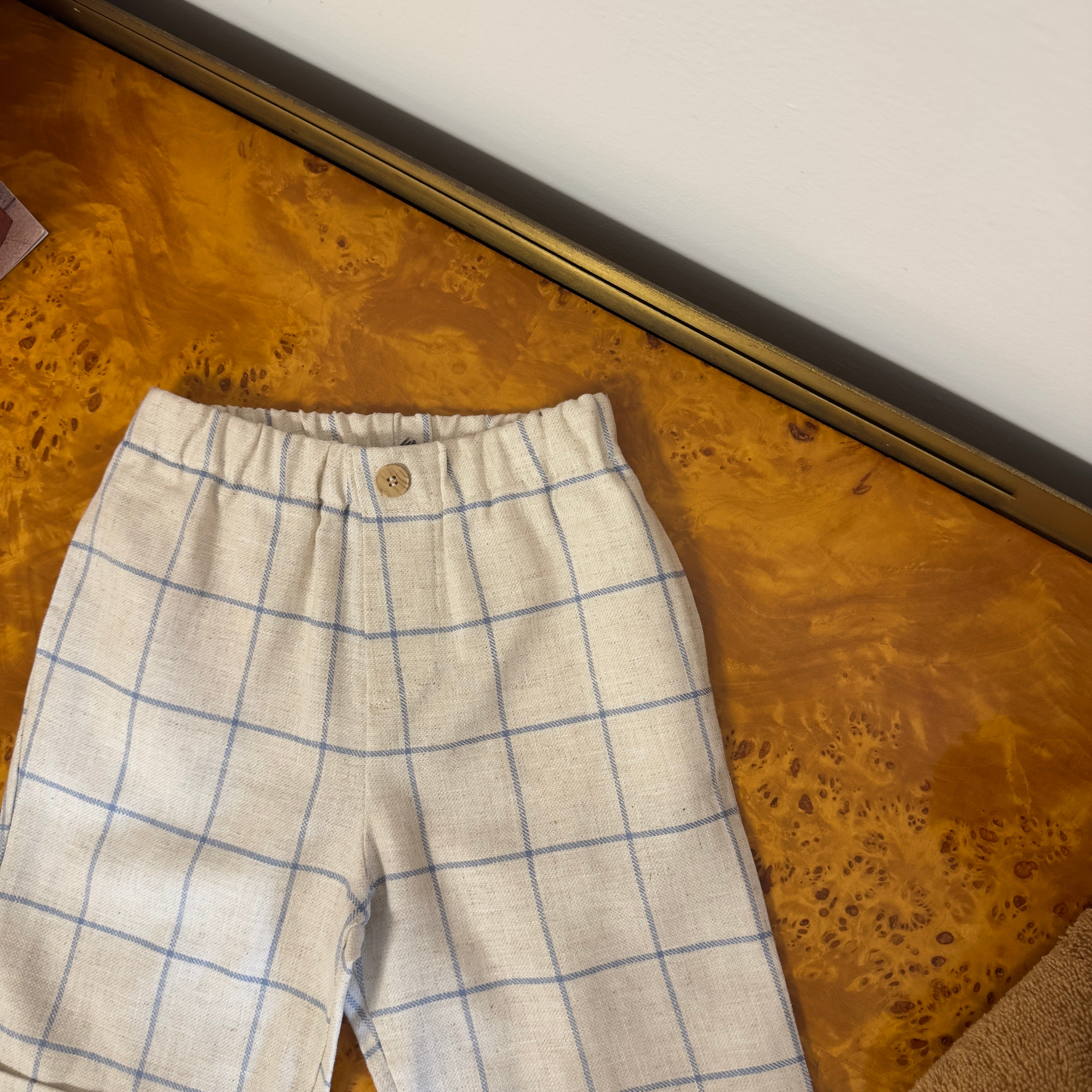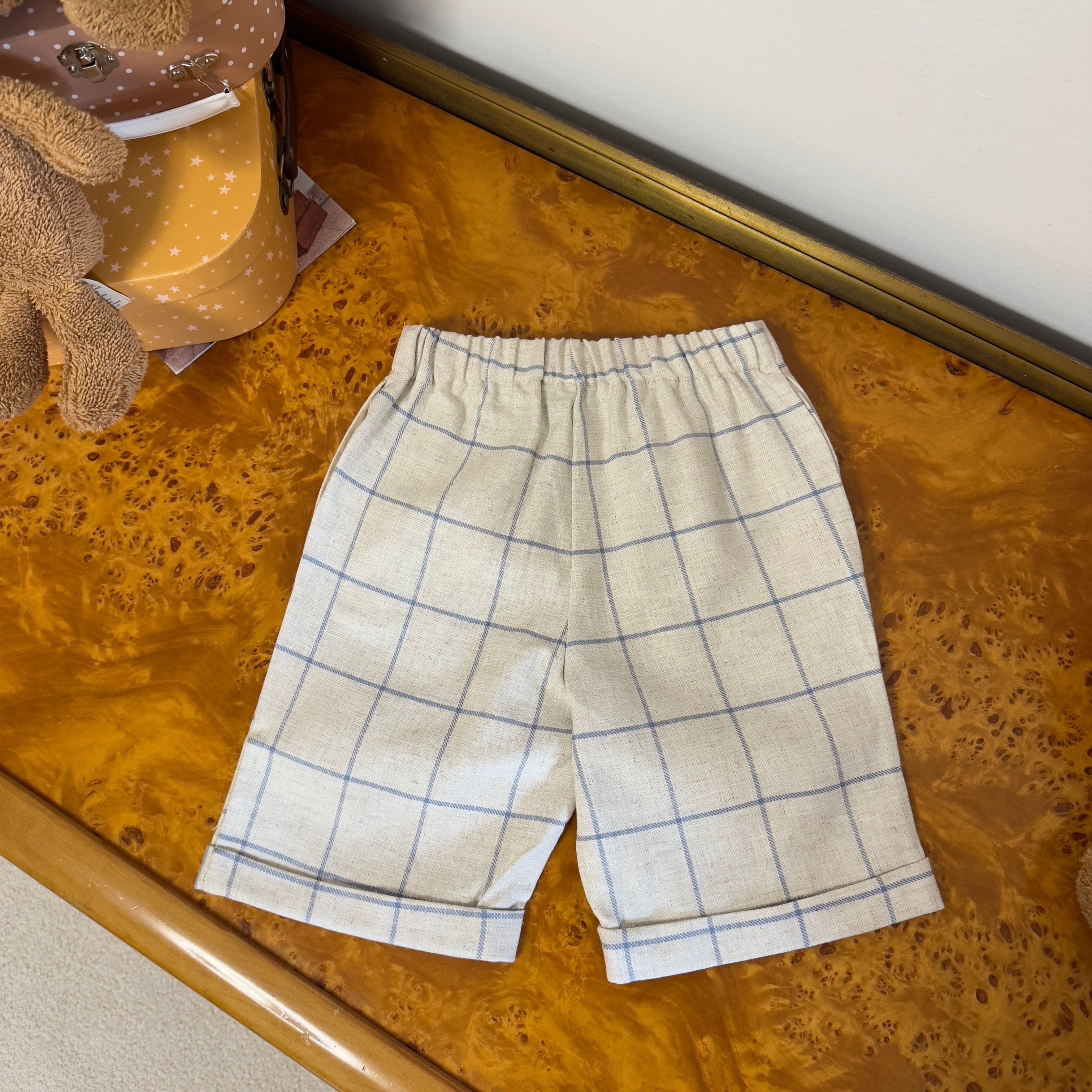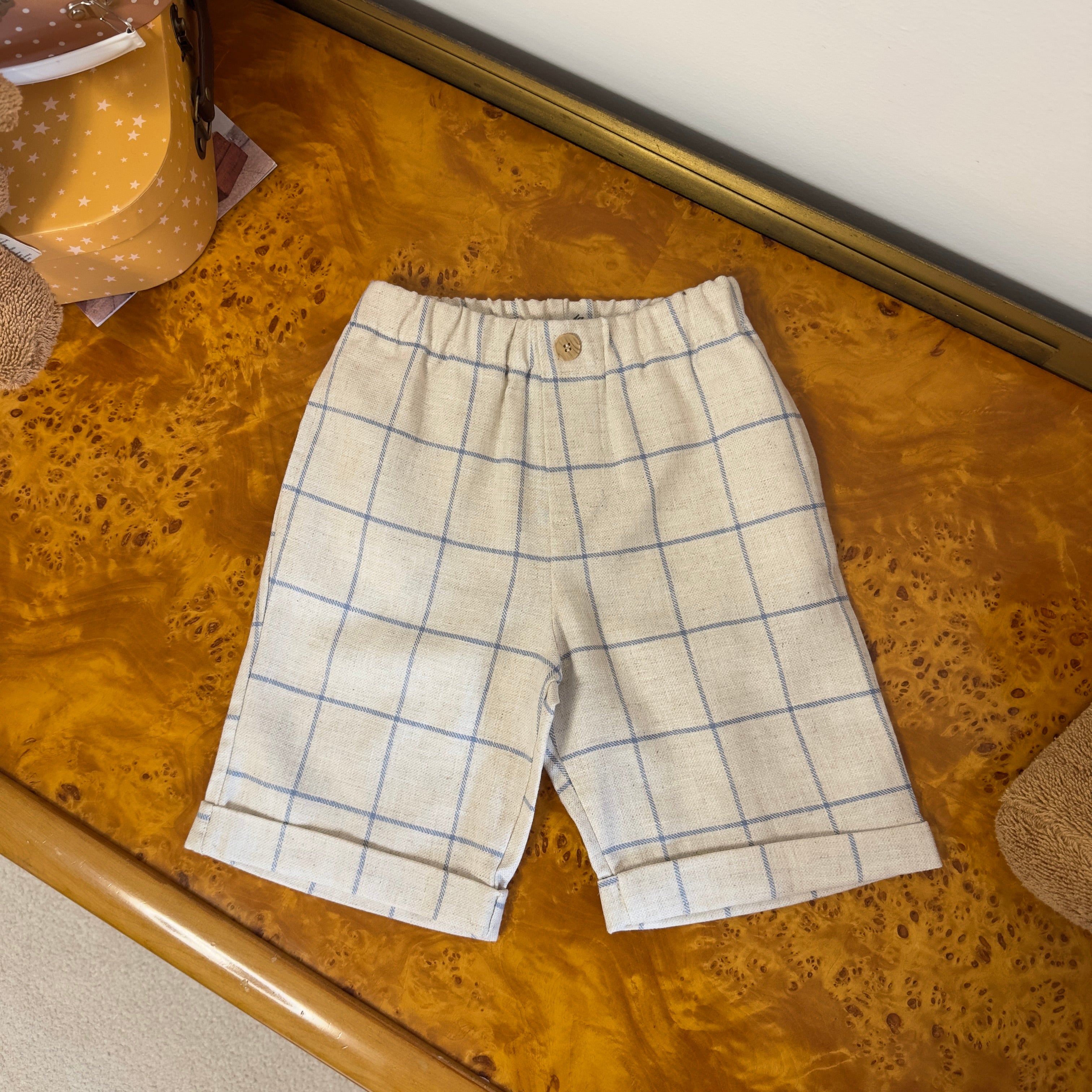 Leo e Lilly - Bermuda in misto lino beige con quadri azzurri – Elegante e versatile