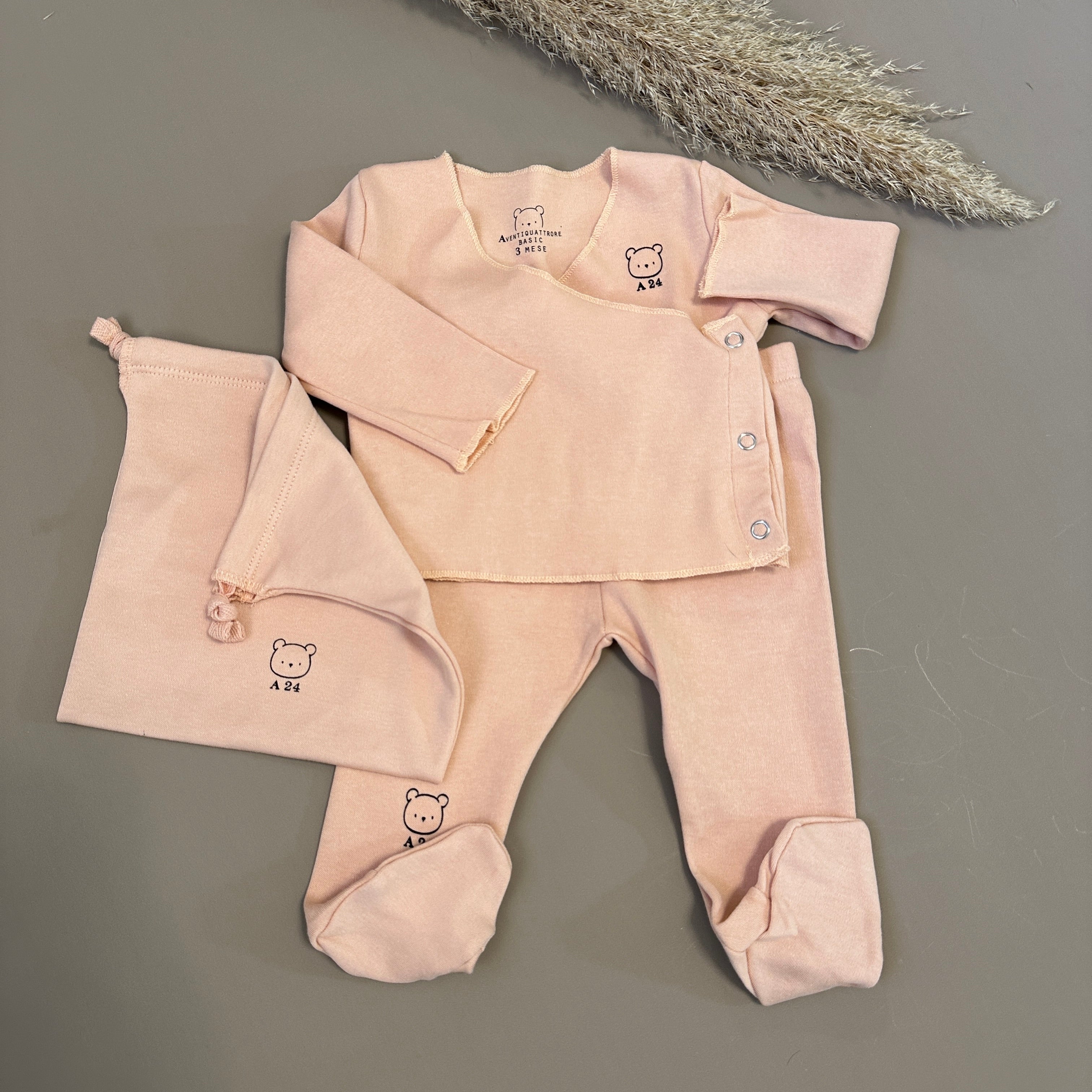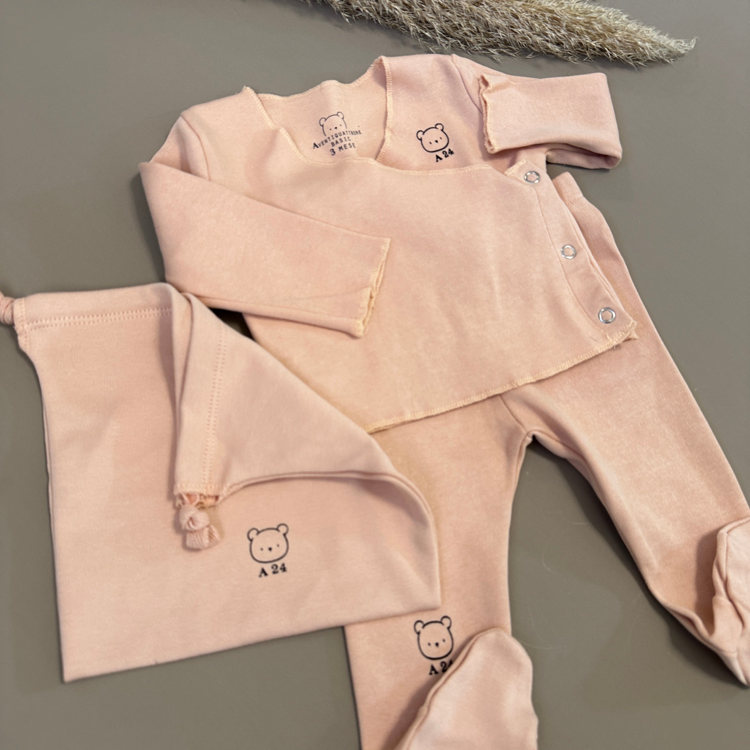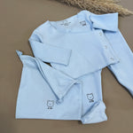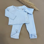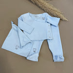 Completo neonato in morbido jersey di cotone color azzurro cielo, composto da maglia con pratica chiusura laterale antipanico e ghettina con piedini. Un set pensato per offrire massimo comfort e praticità fin dai primi giorni, avvolgendo il tuo piccolo con delicatezza. In omaggio una graziosa sacca in cotone abbinata, ideale per riporre piccoli accessori o ricordi preziosi.